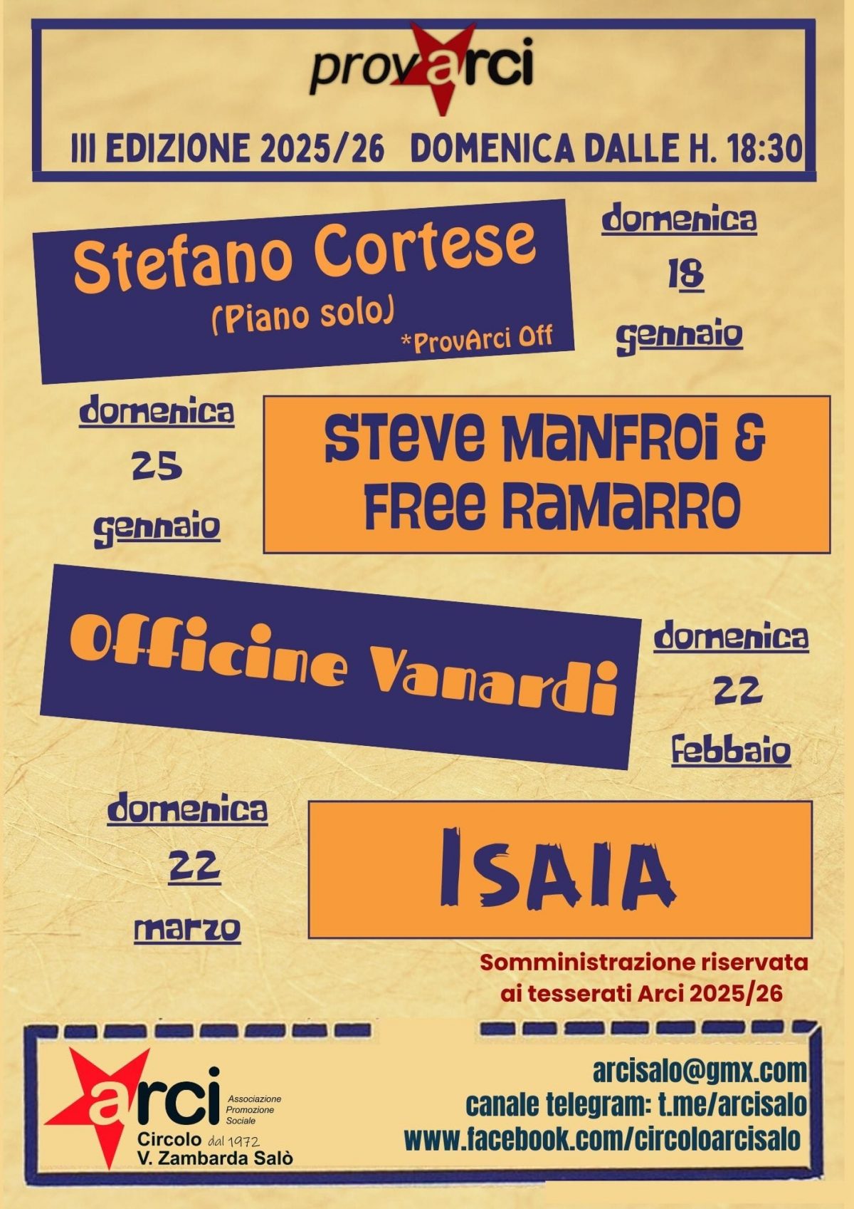 In allegato anche il programma trimestrale dei concerti ProvArci.